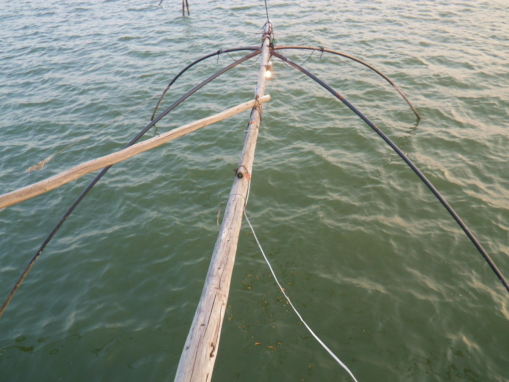 四つ手とはもともと四手網漁法という漁法のことで、写真の小屋から出てる網で魚を採る漁法のことです。小さいものは1メートル四方ぐらいの物もあり、主にシラウオなどを採るのに使います。児島湾のモノはその巨大版で採れるものは時期にもよりますが、ベカやママカリ、セイゴや稀にウナギなども入ります。