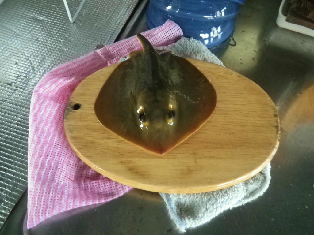 このイカは、採ったらそのまま醤油かポン酢でいただくのが一番うまいです。そのほかに、今回一番最初にあがったのはエイでした。